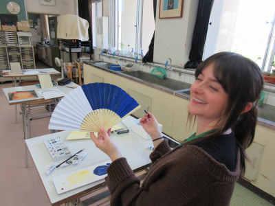 ALT の先生が、来日するお友達のために 扇子に絵を描いていました